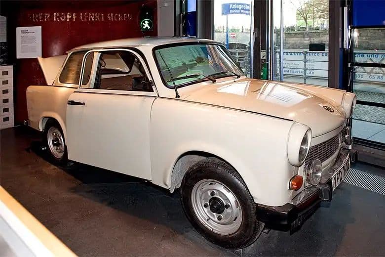 这是东德非常有名的一款小轿车,从50年代末一直生产到它灭亡,而且改动非常小。在特拉比刚出现的时候,还是不错的,跟当时的大众甲壳虫相比,虽然外表稍微丑一点,但各种性能也还可以。只不过,再好的车同样的类型生产30年,再去跟西德或者跟日本、美国其他的车比,就显得落后了。