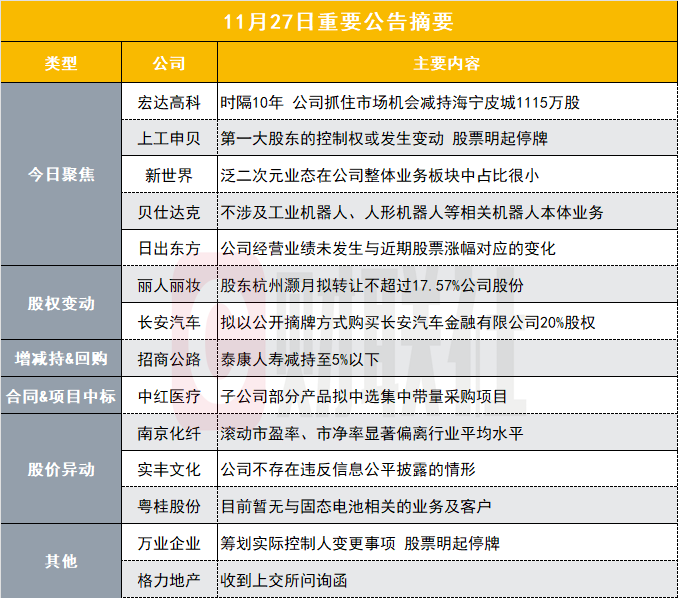 上工申贝公告,公司于2024年11月27日收到第一大股东浦科飞人的通知,因浦科飞人的间接控股股东宏天元合伙的合伙人正在筹划财产份额协议转让事项,该事项可能导致公司第一大股东浦科飞人的控制权发生变动。公司A股股票、B股股票将于2024年11月28日开市起停牌,预计停牌时间不超过2个交易日。