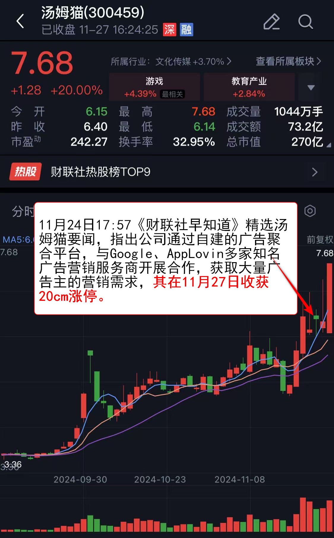 ,指出公司通过自建的广告聚合平台,与Google、AppLovin多家知名广告营销服务商开展合作,获取大量广告主的营销需求,其在11月27日收获20cm涨停。