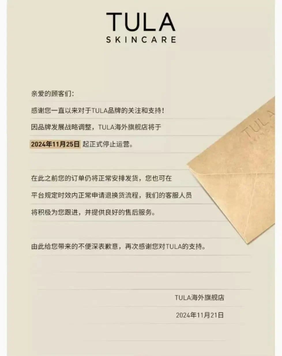 店铺公告称,因“品牌发展战略调整”,TULA海外旗舰店于2024年11月25日起正式停止运营,总运营时间仅两年半。截至目前,TULA天猫海外旗舰店已注销,抖音海外旗舰店已下架全部产品。