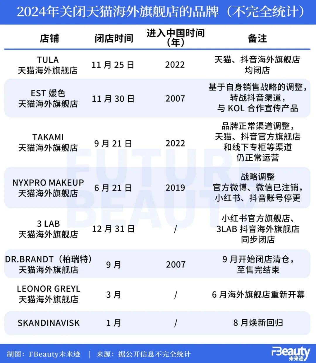 《FBeauty未来迹》发现,在2024年,至少8个外资品牌关闭海外旗舰店,其中包括TULA在内,不乏宝洁、花王、欧莱雅等“美妆大厂”旗下的品牌。但与此同时,这批品牌中有大部分是基于资源聚焦和加强品牌运营目的的渠道调整,而并非撤出中国市场。