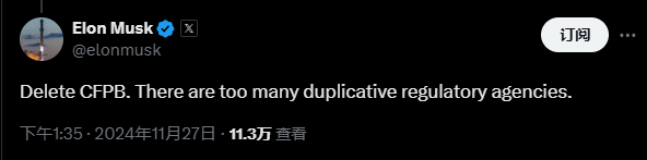 财联社11月28日讯(编辑 赵昊)当地时间周三(11月27日),埃隆·马斯克在社交媒体X上回复其他帖文时写道,“取缔CFPB(消费者金融保护局),这类重复的监管机构太多了。”