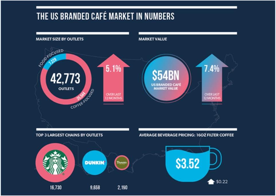 根据世界咖啡门户网站在10月底发布的美国连锁咖啡品牌市场报告显示,美国有共计超过500个咖啡连锁品牌,经营门店数量超过42700多家,目前市场规模达540亿美元,而根据Research and Markets的数据显示,美国咖啡市场在预测期(2024-2029年)内复合年增长率为3.69%。