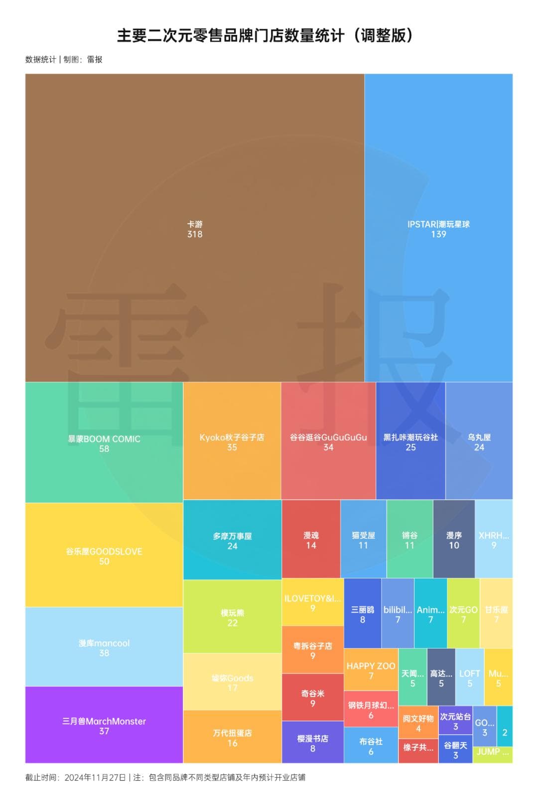 根据雷报的统计,国内布局多家线下门店且具有一定知名度的二次元零售品牌至少有42个(人工统计存在误差,如有遗漏欢迎评论区补充),累计开出门店1022家。雷报在上期推文中重点展开介绍了其中6家品牌的发展现状和未来规划,本期将继续这一话题,介绍另外几家具有代表性的二次元零售品牌。