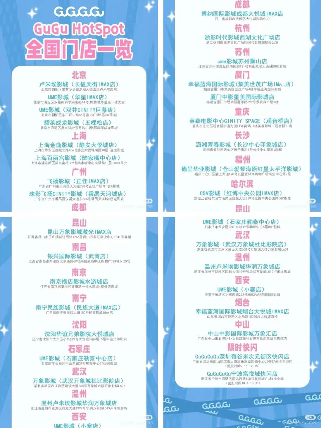 依托路画影视的资源优势,谷谷逛谷GuGuGuGu将IP内容、商品、互动体验一体化整合,打造了IP集合店铺品牌GuGu Home(谷子+咖啡+互动体验)、与全国院线合作的电影院一站式IP集结地GuGu HotSpot 2个店型。其中,GuGu Home 全国首店位于百联ZX创趣场于4月17日试营业,GuGu HotSpot则在4月30日的电影上映日于全国35家主题影城落地。