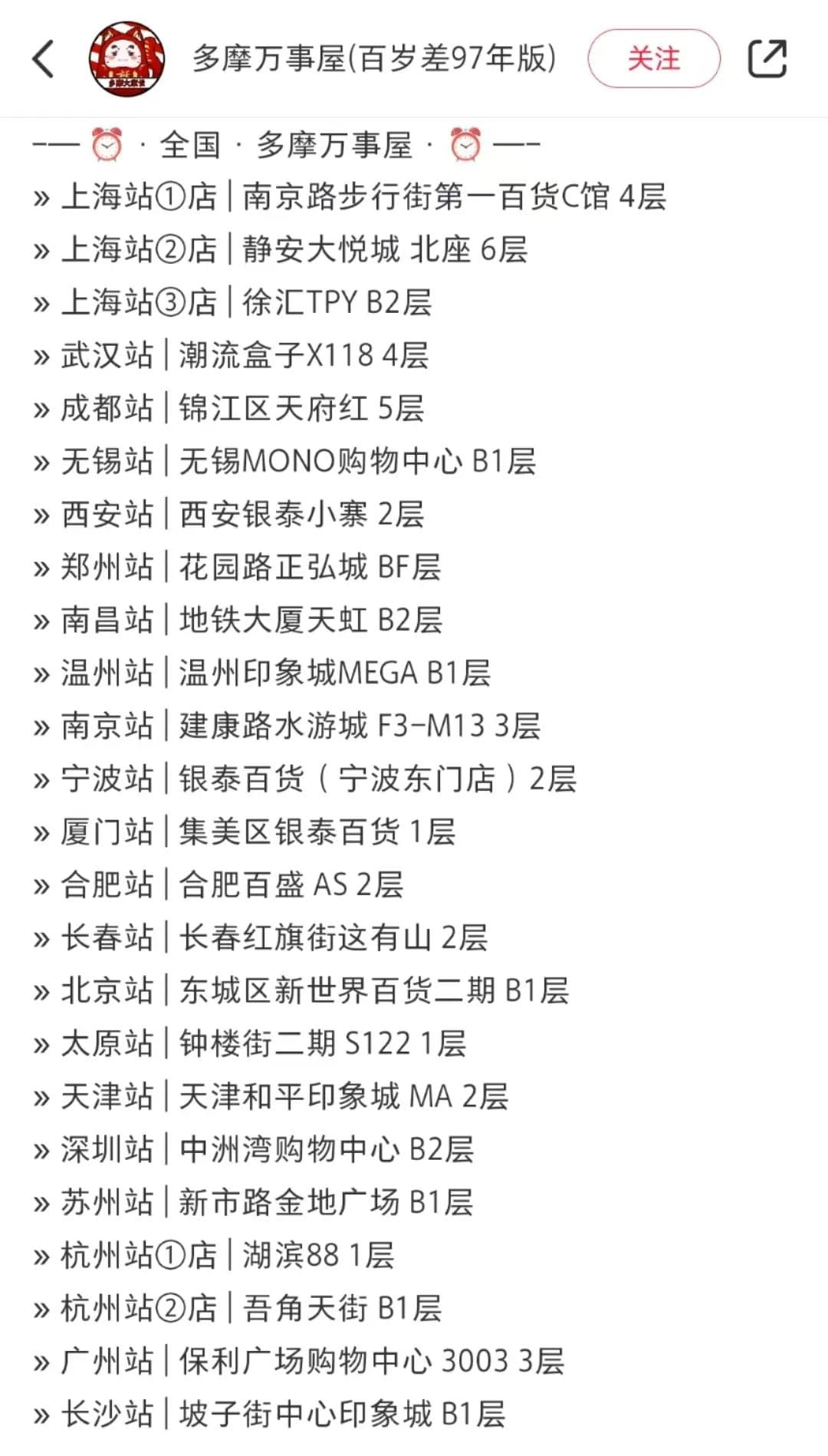 2023年6月,多摩万事屋于上海南京路步行街第一百货C馆4楼的第一绮丽次元街区开出第一家线下门店,随后同样开始全国拓店布局。截至11月8日,其官方小红书公布的数据显示,多摩万事屋共在全国21座城市开出24家线下门店。此外,根据网络公开信息显示,多摩同样曾计划在年内开出百家线下门店。