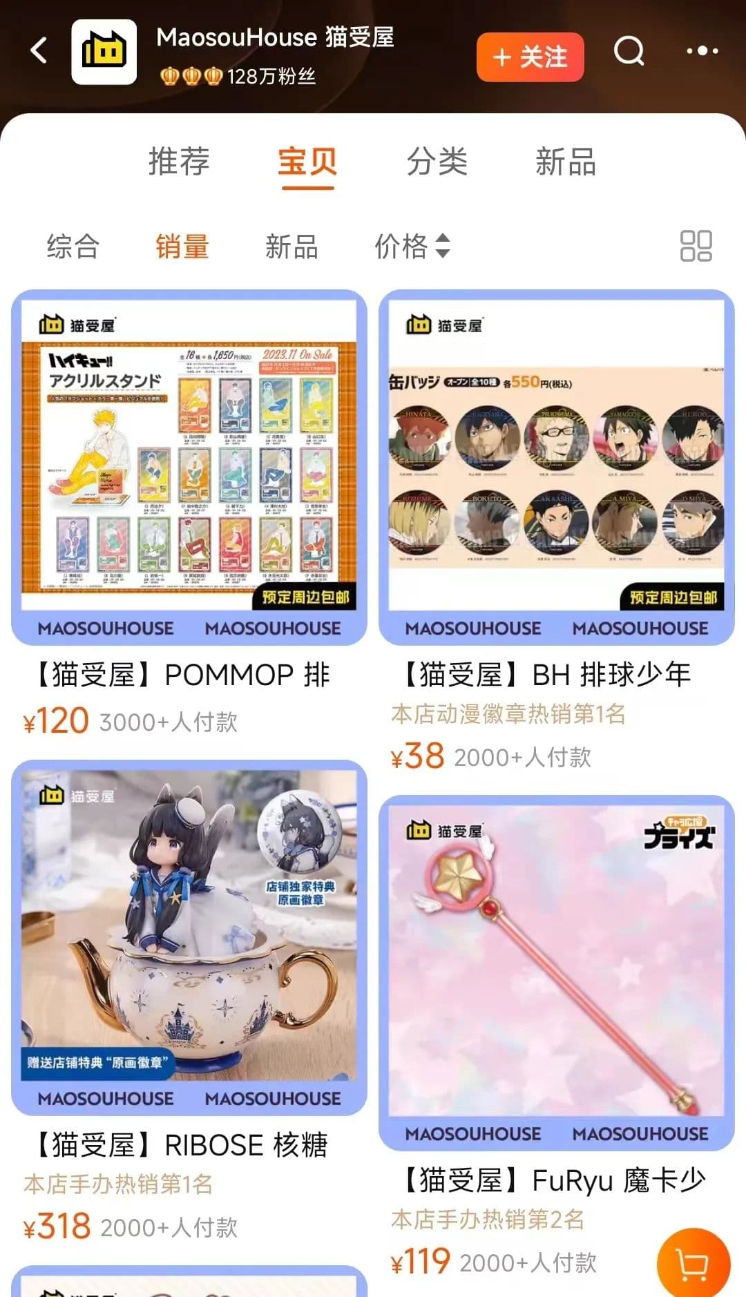 同模玩熊一样,猫受屋也是是淘宝手办模型行业的资深老店,旗下经营贩售正版手办模型、官方周边等ACG领域商品,拥有业内数量最多、质量最优的消费人群,销量、信用和服务态度都常年在同行业中占据前列,目前的淘宝官方店铺粉丝也同样超过百万达128万。