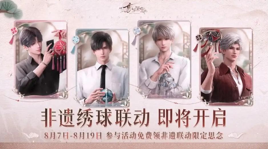 公测还不到一年却已经顺利登顶的《恋与深空》自然也忘不了非遗这张牌,今年七月份游戏上线以“缘起靖西,绣意定情”为主题的非遗绣球联动。玩家可以通过做活动白嫖男主们的三星卡,以及绣球藏品、称号、拍照动作等奖励。比起其他千篇一律的三星卡,这几张非遗三星卡的卡面,倒确实挺用心,绣球的精细程度颇高。