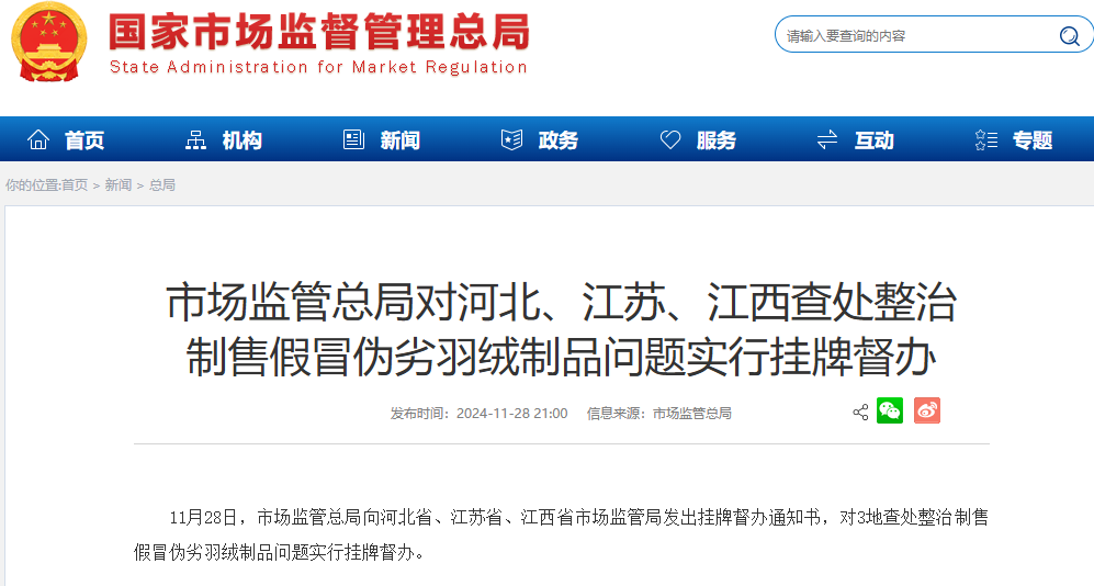 市场监管总局对3地整治制售假羽绒制品挂牌督办