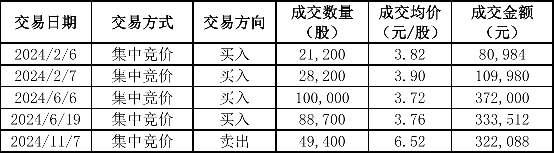 2024年11月7日,以6.52元/股的均价卖出49,400股,成交金额322,088元。