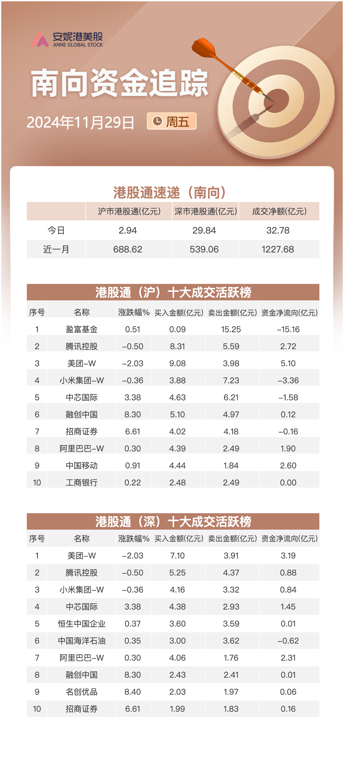 11月29日,南向资金成交549.73亿港元,当日净流入约32.78亿港元。其中沪港股通净流入2.94亿港元,深港股通净流入29.84亿港元。