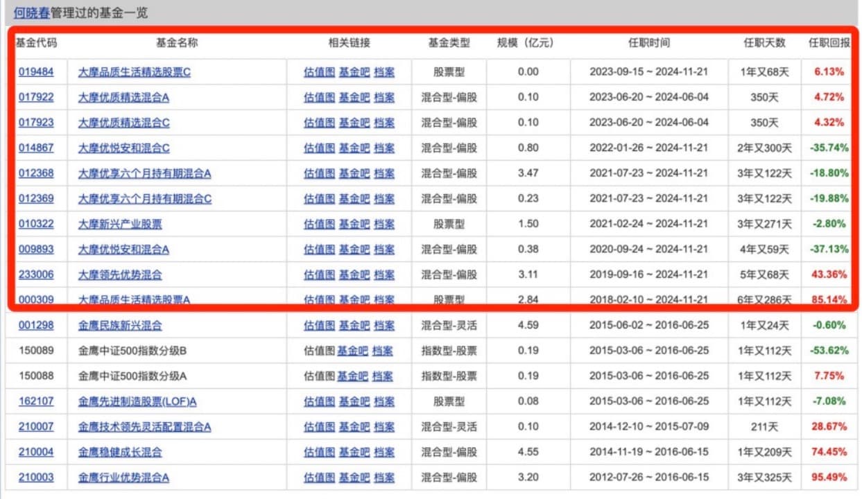 今年6月,何晓春旗下大摩优质精选,因连续50个工作日出现基金资产净值低于5000万元情形而清盘。该产品运行仅一年,A、C份额分别获4.72%、4.32%任职回报。