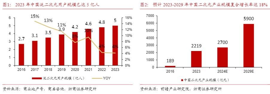 近年来,年轻人对二次元、潮玩等内容及周边衍生品的消费需求持续上涨。根据前瞻产业研究院数据,2016-2023年,中国二次元产业规模从189亿元增长至2219亿元,复合增速42%;预计至2029年,二次元产业规模将达到5900亿元。