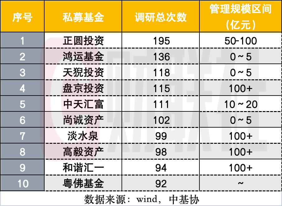 这期间,调研总次数超百次的私募共6家,调研个股超百只的私募有5家。