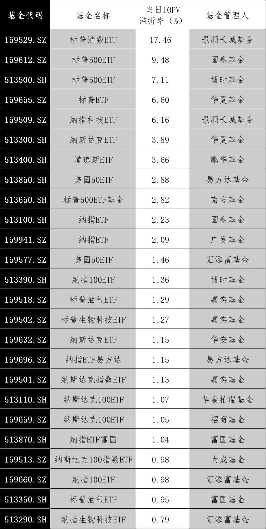 同时,多只跨境ETF高溢价情况较为明显。其中,标普消费ETF溢折率一举跃升至17.46%,这也是当前溢折率最高的跨境ETF。国泰基金旗下标普500ETF、博时基金旗下标普500ETF、华夏基金旗下标普ETF、景顺长城基金旗下纳指科技ETF目前溢折率均在6%以上。这也说明了,部分跨境ETF在市场上供不应求的现象显著,市场热度极高。