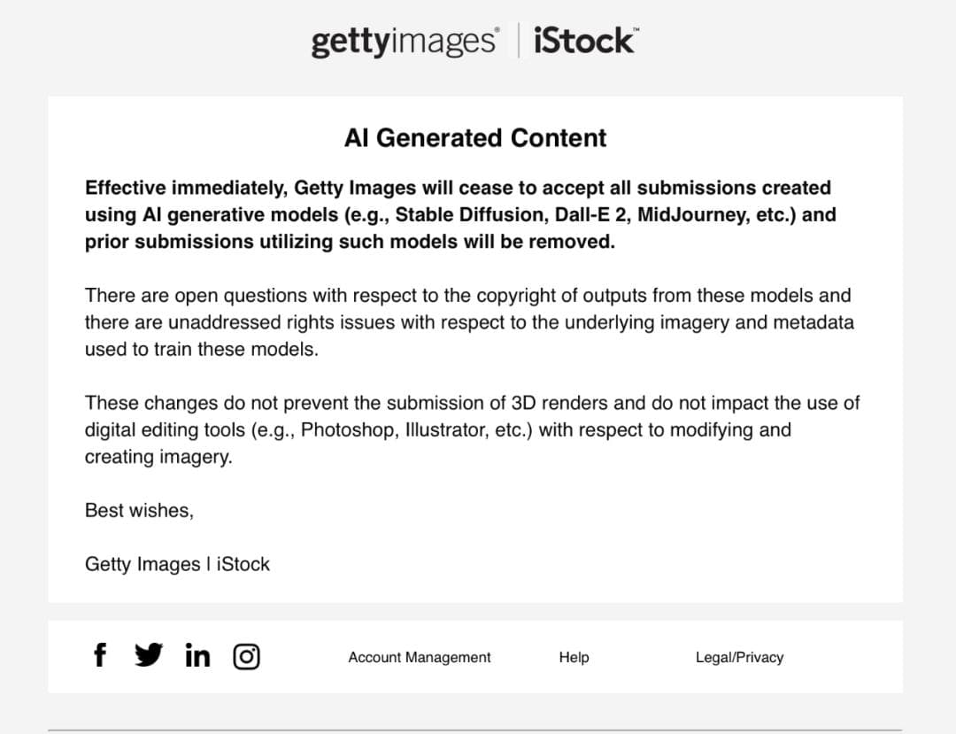 图:Getty Images联合旗下平台iStock 发布的禁止AI图片公告 图源:官网截图