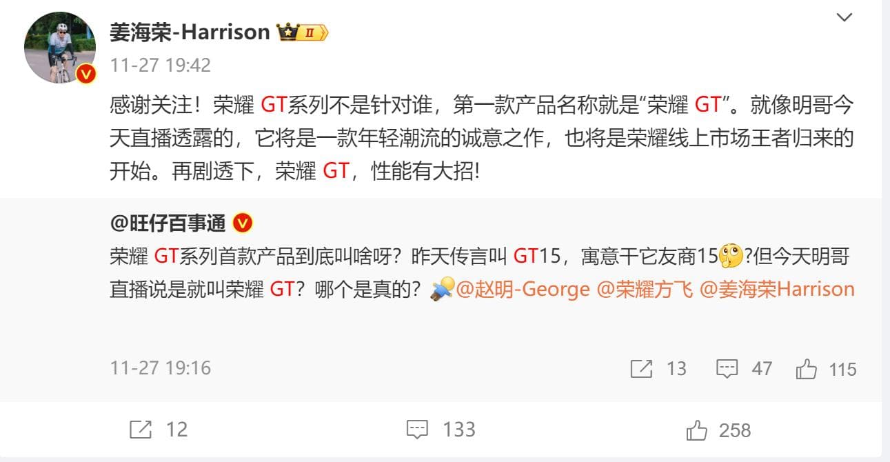 除了荣耀300系列,荣耀全新GT系列也有望在12月面世。按照荣耀终端有限公司中国区CMO姜海荣的说法,荣耀GT系列不同于以往的荣耀X50 GT、荣耀80 GT、荣耀90 GT等机型,是全新的一个系列,主打线上市场,性能方面有大招。