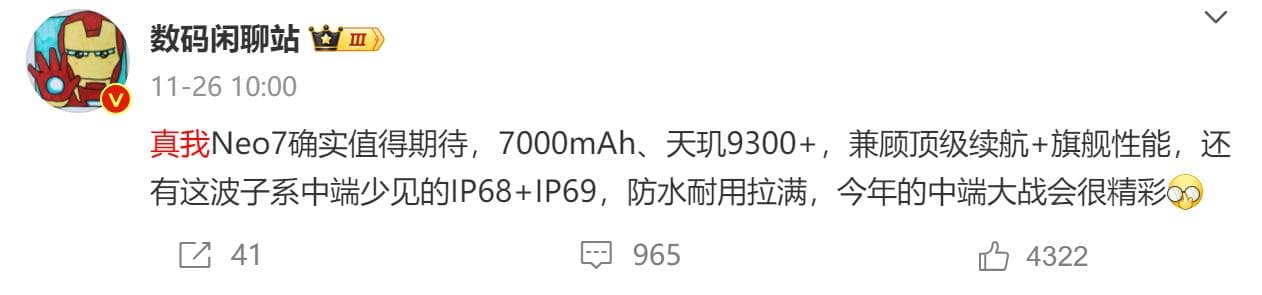 真我Neo7的定位与荣耀全新GT系列相同,主打性能和游戏体验,搭载联发科上一代旗舰处理器天玑9300+,安兔兔跑分超过200万分。@数码闲聊站还爆料称,真我Neo7将搭载7000mAh电池、IP69+IP68,将续航和防水性能拉满。其他配置方面,真我Neo7或将搭载1.5K挖孔直屏,机身厚度预计在8.5mm左右。据官方透露,真我Neo7起售价不超过2499元。