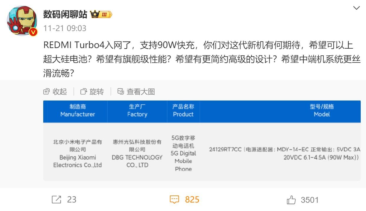 而在K80之下,REDMI可能还要在12月推出一款定位更低的机型——Turbo 4。日前该机型已入网,配备90W快充技术。数码博主曝出的信息称,REDMI Turbo 4搭载1.5K直屏,电池容量为6500mAh,或将首发天玑8400处理器。