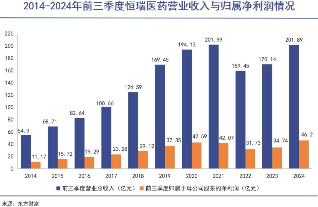 三季度,恒瑞医药实现营业收入65.89 亿元,同比增长12.72%;实现归母净利润11.88 亿元,同比增长1.91%;实现扣非净利润11.26亿元,同比增长0.84%。