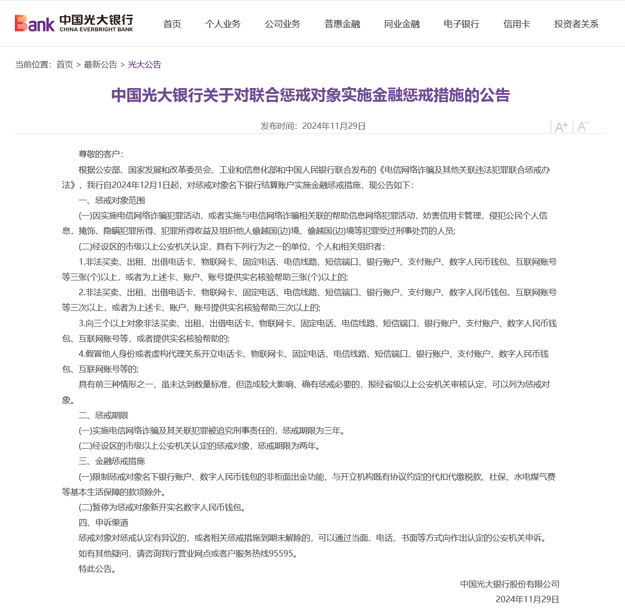 财联社记者注意到,日前光大银行在官网发文称,自2024年12月1日起,将对惩戒对象名下银行结算账户实施金融惩戒措施。