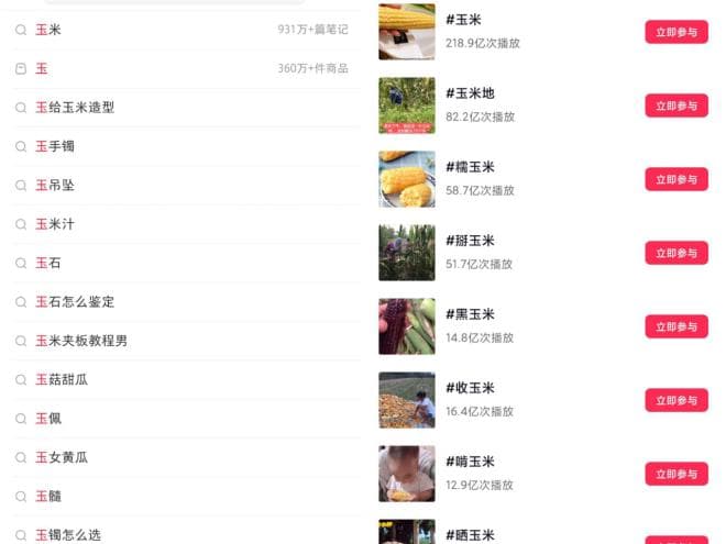 玉米搜索需求的激增,让玉米在媒体端的曝光也进一步增加。如抖音上,玉米相关话题多达500亿的曝光,其中#玉米218亿、#糯玉米58.6亿、#黑玉米14.8亿等;小红书上,有关玉米的种草笔记更是不计其数,竟有890万篇,且还在不断增加。