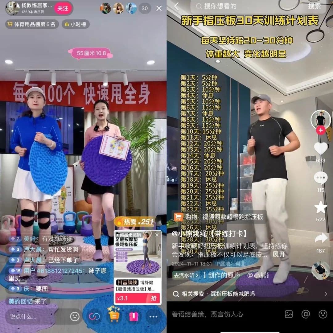 在综艺节目中作为惩罚道具的指压板,带上“超慢跑”“足底按摩”等概念,摇身一变,成了新一代减肥搭子,开始出现在各大抖音达人的直播间、种草视频中。