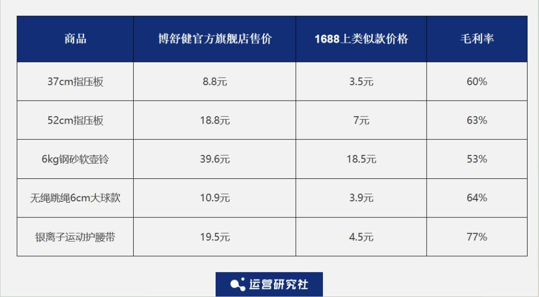 除了指压板,博舒健在抖音的热销商品还有之前抖音平台流行的壶铃、跳绳等运动器材,产品定价大多在 10-50 元,按照 1688 上类似商品的批发价格估算,毛利率基本在 50%-70% 。