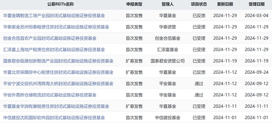 包括创金合信首农产业园REIT在内,11月29日共三单REITs申报至交易所,当前在交易所受理阶段的REITs产品达到13只。另外,处于已获批待发行上市状态的REITs还有9只。