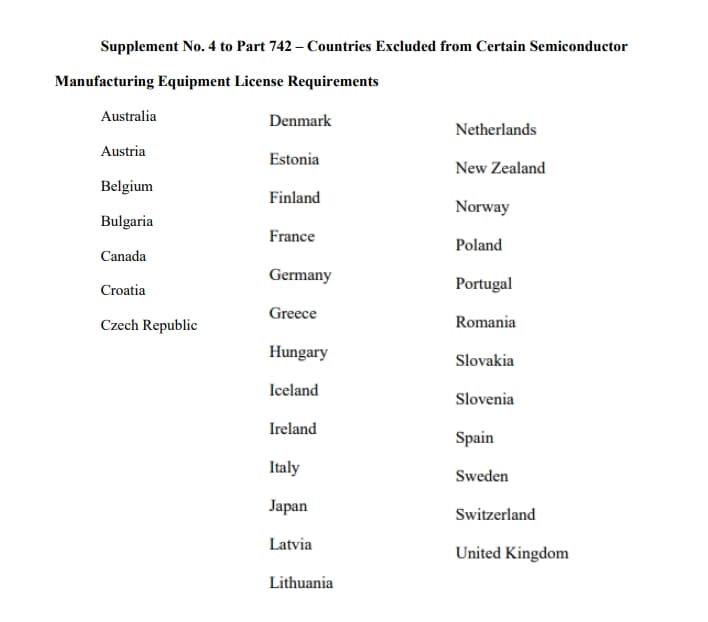 值得一提的是,包括荷兰、日本、意大利、法国等30多个国家获得了美国商务部的豁免,不受周一发布的新规影响。