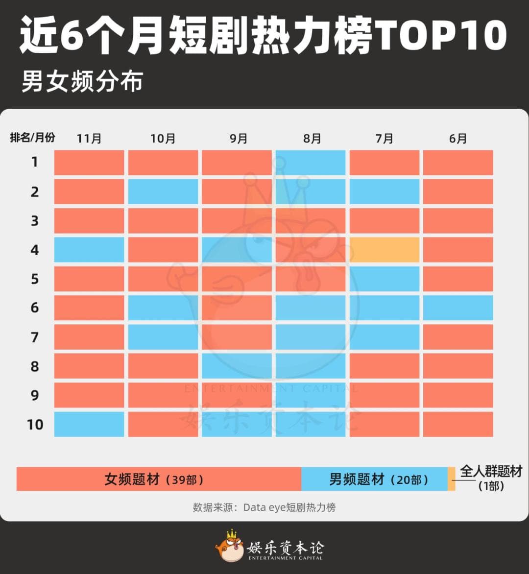 以11月榜单为例,热力榜前10的短剧中,只有第4名《我都入赘了,你说我爹是首富》与第10名《国士不可辱》贴有男频的标签。从今年6月到11月,热力榜月榜前10中,男频短剧数量只占1/3,女频短剧占39部,占到整体的2/3。