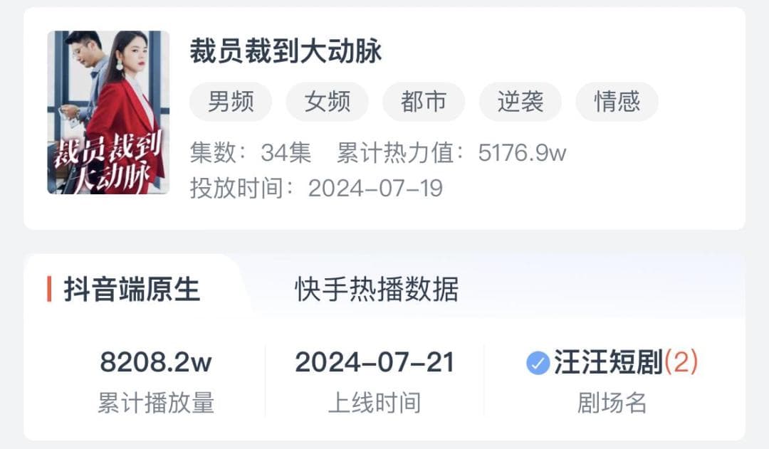 今年7月,一部名叫《裁员裁到大动脉》的短剧收获5176.9万热力值,成为当月月榜TOP4,在这部短剧的分类tag里既有男频也有女频。祁玥熹将这类短剧,称为“全民题材”的短剧:涉及题材与社会中的热点议题相关,故事更具有普世性,男女通吃,能引起所有群体的共鸣。