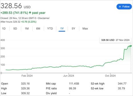 Applovin的股价同样伴随着业绩起飞了,最近1年股价暴涨了700%: