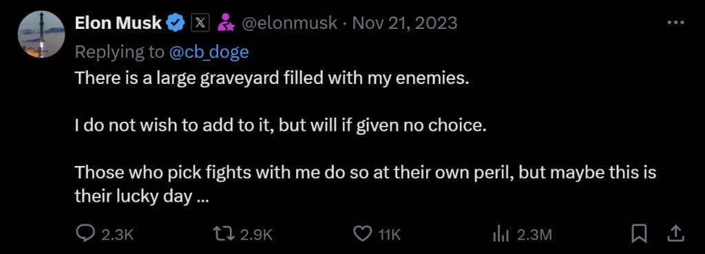 2022年收购推特(后改名为X)后,马斯克将目标对准了从X撤资的广告商。他对广告商说:“去你丫的,明白了吗?” 接着,马斯克喷了暂停在X支出广告费的迪士尼的CEO Bob Iger:“不要再做广告了!”