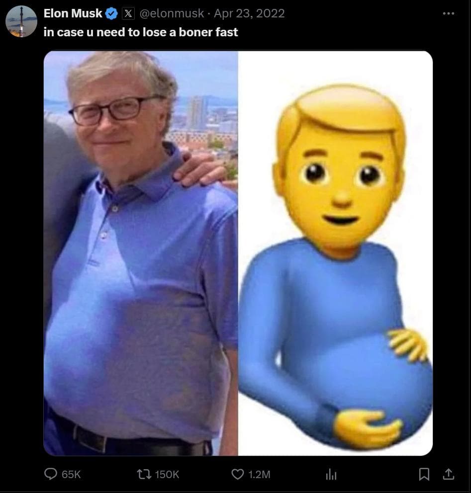 此前,比尔·盖茨因做空特斯拉股票而进入了马斯克的敌人名单。愤怒之下,马斯克在X上将比尔·盖茨的照片和孕妇emoji拼在一起,并配文:“如果你想迅速失去性趣,看看这个。”