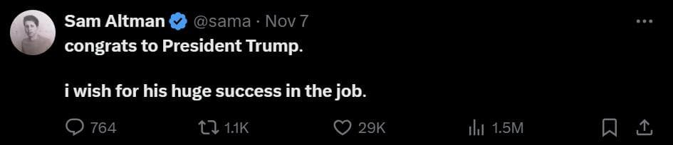 在特朗普获胜的早晨,奥特曼在X上发文祝贺,并且打破了他一贯的小写风格,以示对特朗普的尊重,奥特曼写道: