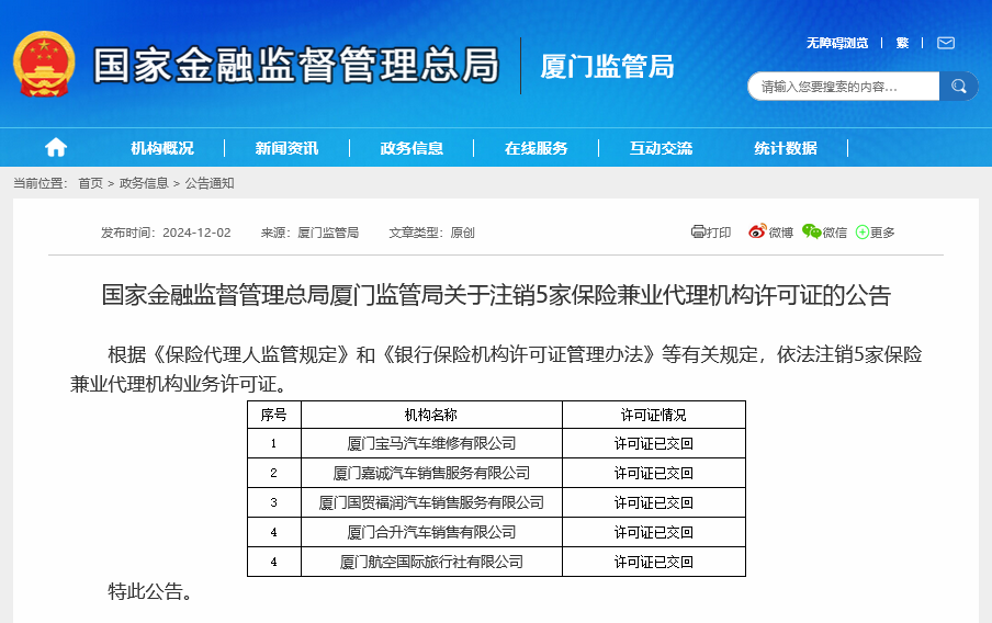 该局称,根据《保险代理人监管规定》和《银行保险机构许可证管理办法》等有关规定,依法注销厦门宝马汽车维修有限公司、厦门嘉诚汽车销售服务有限公司、厦门国贸福润汽车销售服务有限公司、厦门合升汽车销售有限公司、厦门航空国际旅行社有限公司等5家保险兼业代理机构业务许可证。