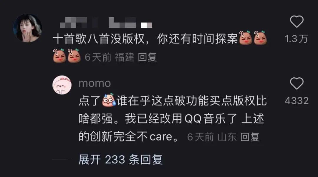 结果抄袭的事儿没闹多大,网易云音乐却因为版权少被网友嘴了个遍。但 QQ 音乐也免不了被吐槽,大家的态度无非就是:QQ 音乐两巴掌,网易云音乐更是降龙十八掌。