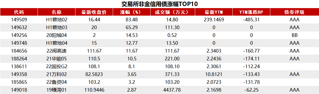 据Choice 数据统计显示,今日交易所市场非金信用债涨幅排行前五的分别是:H1碧地02、H1碧地03、20阳城04、H1碧地04、22闽高速。具体如下: