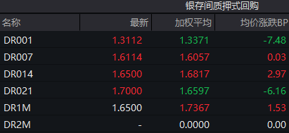 银行间回购定盘利率多数上涨。FR001报1.4600%,跌9.00个基点;FR007报1.7500%,涨2.00个基点;FR014报1.8000%,涨5.00个基点。