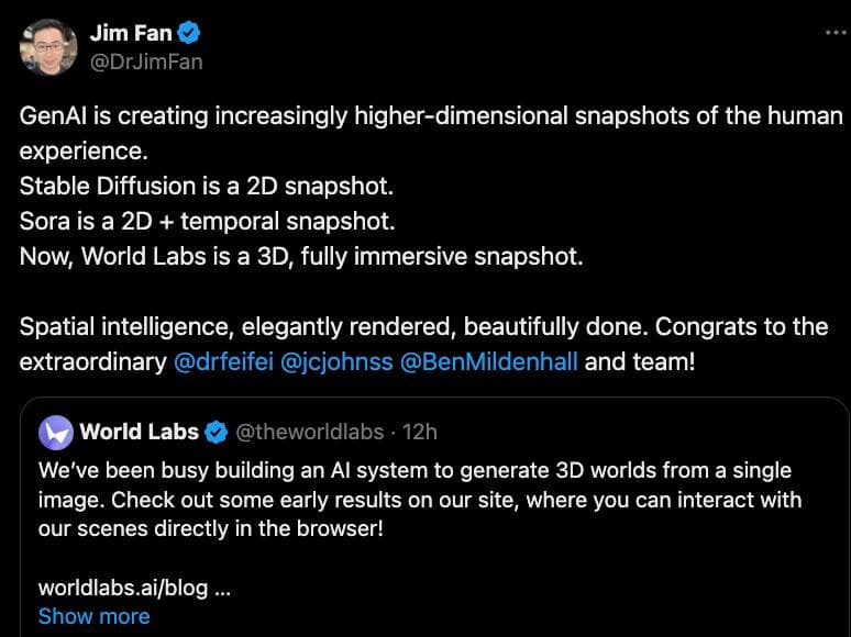 英伟达高级研究科学家Jim Fan用一句话总结了这段AI内容进化史:“GenAI正创造更丰富层次的环境缩影;Stable Diffusion是2D缩影;Sora是2D+时间维度的缩影;而World Labs是3D、沉浸式的缩影”。