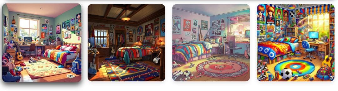 一间充满活力的卡通风格青少年卧室,床上铺着色彩鲜艳的毯子,书桌上摆放着一台电脑,墙上贴着海报,还有散落的运动装备。一把吉他靠在墙上,中间放着一张舒适的带图案地毯。窗户透出的光线给房间增添了温暖、年轻的氛围。