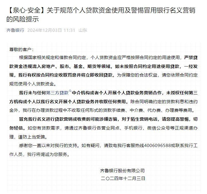 12月3日,齐鲁银行在官方微信公众号发布了“关于规范个人贷款资金使用及警惕冒用银行名义营销的风险提示”。