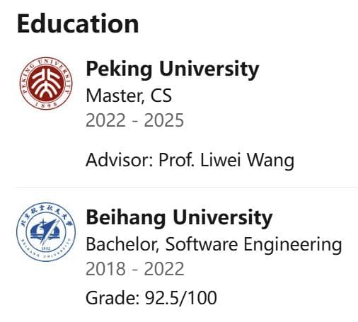 资料显示,田柯宇本科毕业于北航软件学院,研究生就读于北大,师从王立威教授,研究兴趣为深度学习的优化与算法。