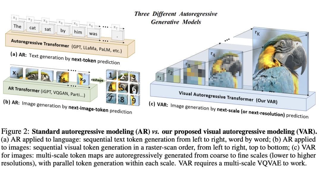 同样,受到广泛使用的多尺度设计的启发,研究人员将图像的自回归学习定义为图2(c)中的「下一个尺度预测」,不同于传统图2(b)中的「下一个token的预测」。