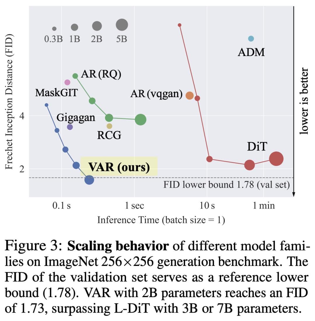 不过,这些AR模型的scaling law未得到充分的探索,而且性能远远落后于扩散模型,如下图3所示。