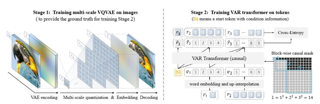 VAR包括两个独立的训练阶段:在图像上训练多尺度VQVAE,在token上训练VAR Transformer。