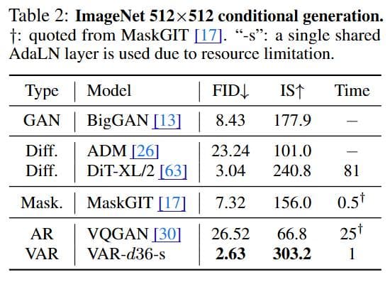 田柯宇团队在ImageNet 256×256和512×512条件生成基准上测试了深度为16、20、24和30的VAR模型,并将其与最先进的图像生成模型家族进行比较,包括生成对抗网络(GAN)、扩散模型(Diff.)、BERT 风格的掩码预测模型(Mask.)和 GPT 风格的自回归模型(AR)。