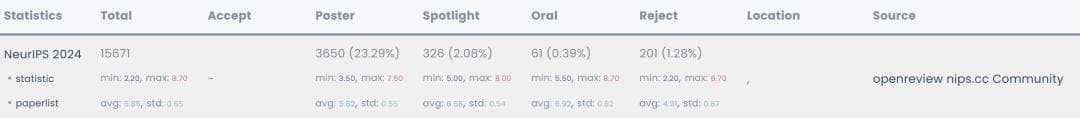 今年,顶会一共接受了15671篇论文,录用率为25.8%,其中评审最低分2.2,最高分8.7,具体来说: