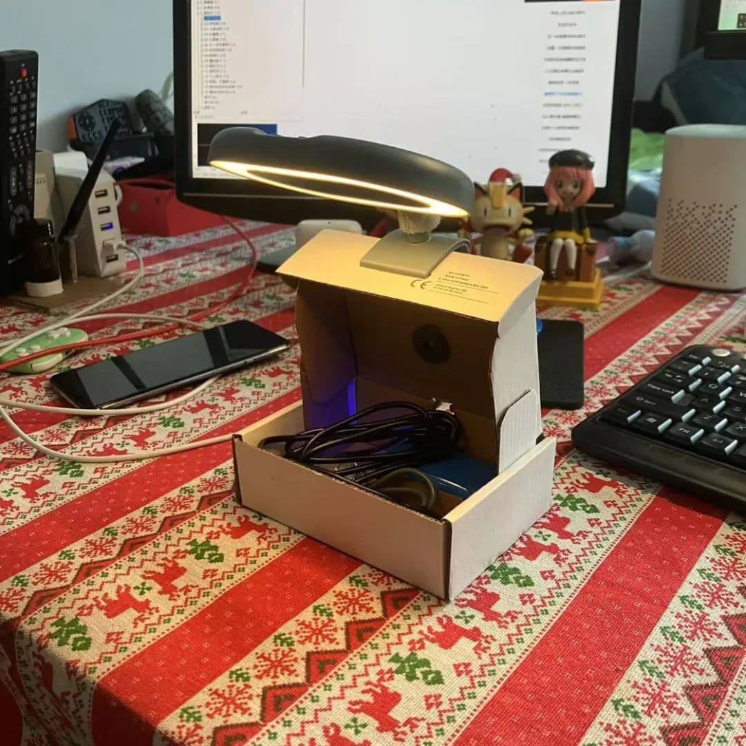 于是我很快就利用手边的材料为它制作了一个底座,然后在思考了多种供电方案后,最终选择在某宝上定制一块电池组来为它供电。完成后的最终成品长这样: